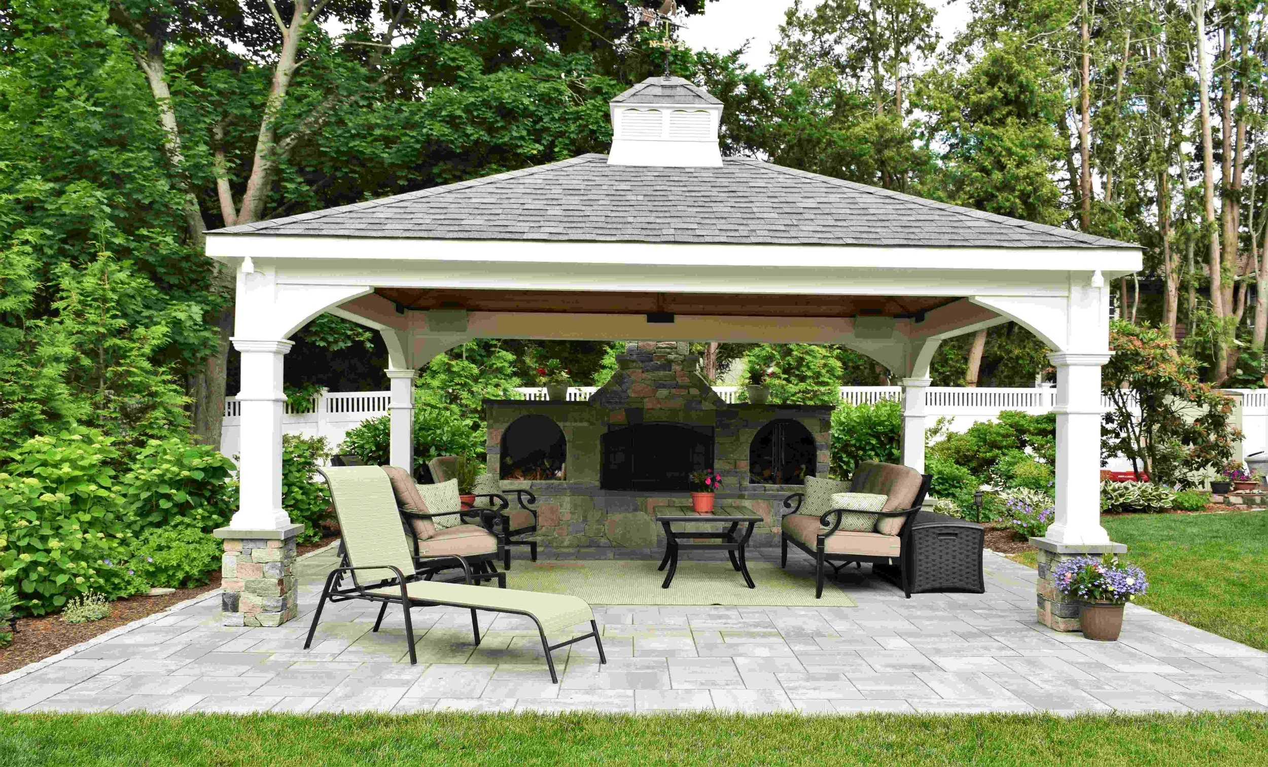 When the owners of this house moved into their new house, the front yard had beautiful landscaping, but the back yard was a large expanse of lawn. They love to entertain and spend as much time outside as they can throughout the season, so they had a list in hand of elements they wanted to include in their new yard. On the top of their list was a fireplace and covered area for hanging out with friends. We nestled a fireplace and pavilion into new gardens on one end of the yard, with a view across the yard, providing a panoramic view of the new planting beds that now surround the yard. Tucked around the side of the house, we added a smaller patio that is immersed in the garden and is the perfect spot for morning coffee or and afternoon book. Finally, we designated a space for the homeowner (an avid gardener) to build her vegetable garden.