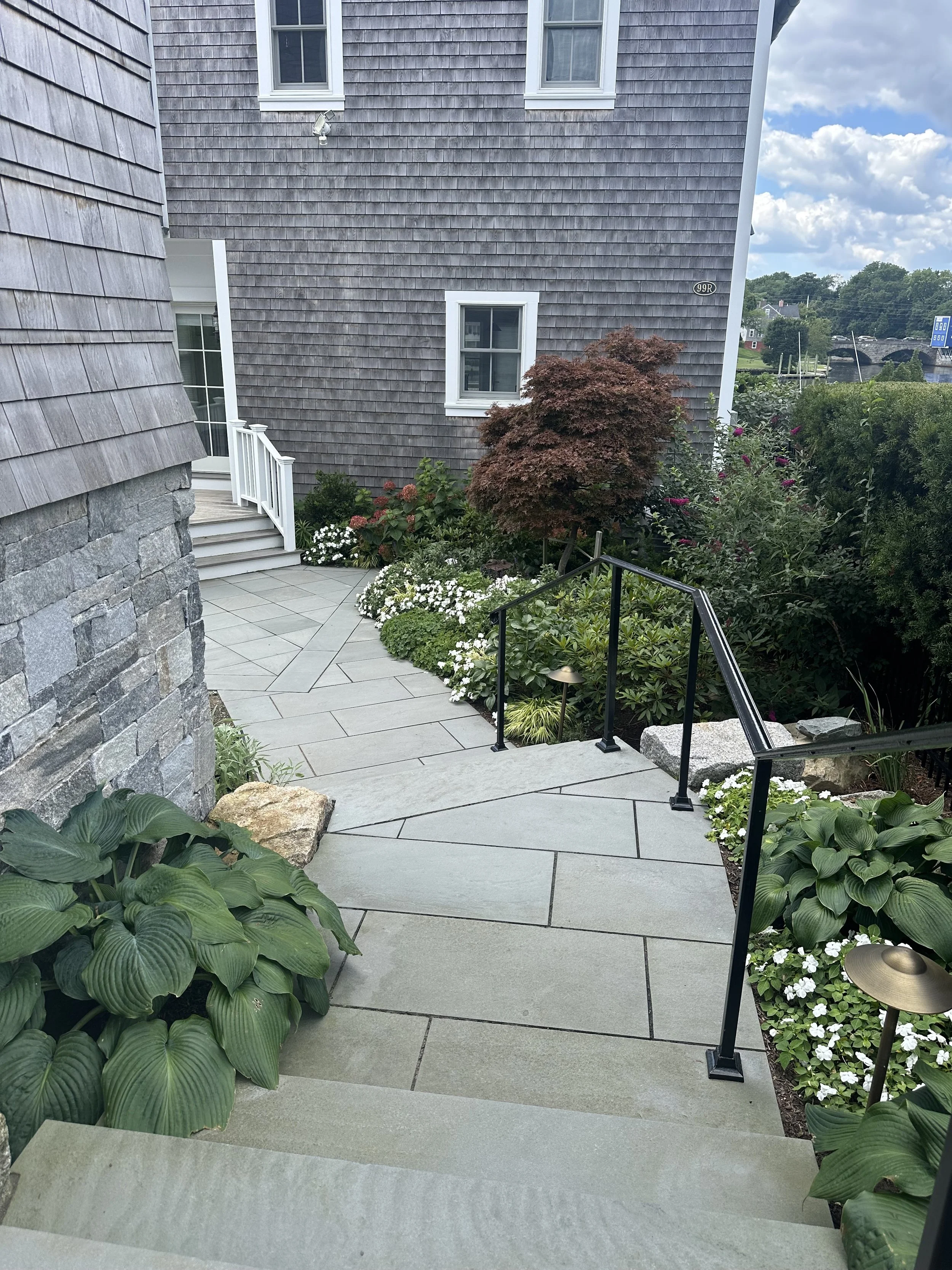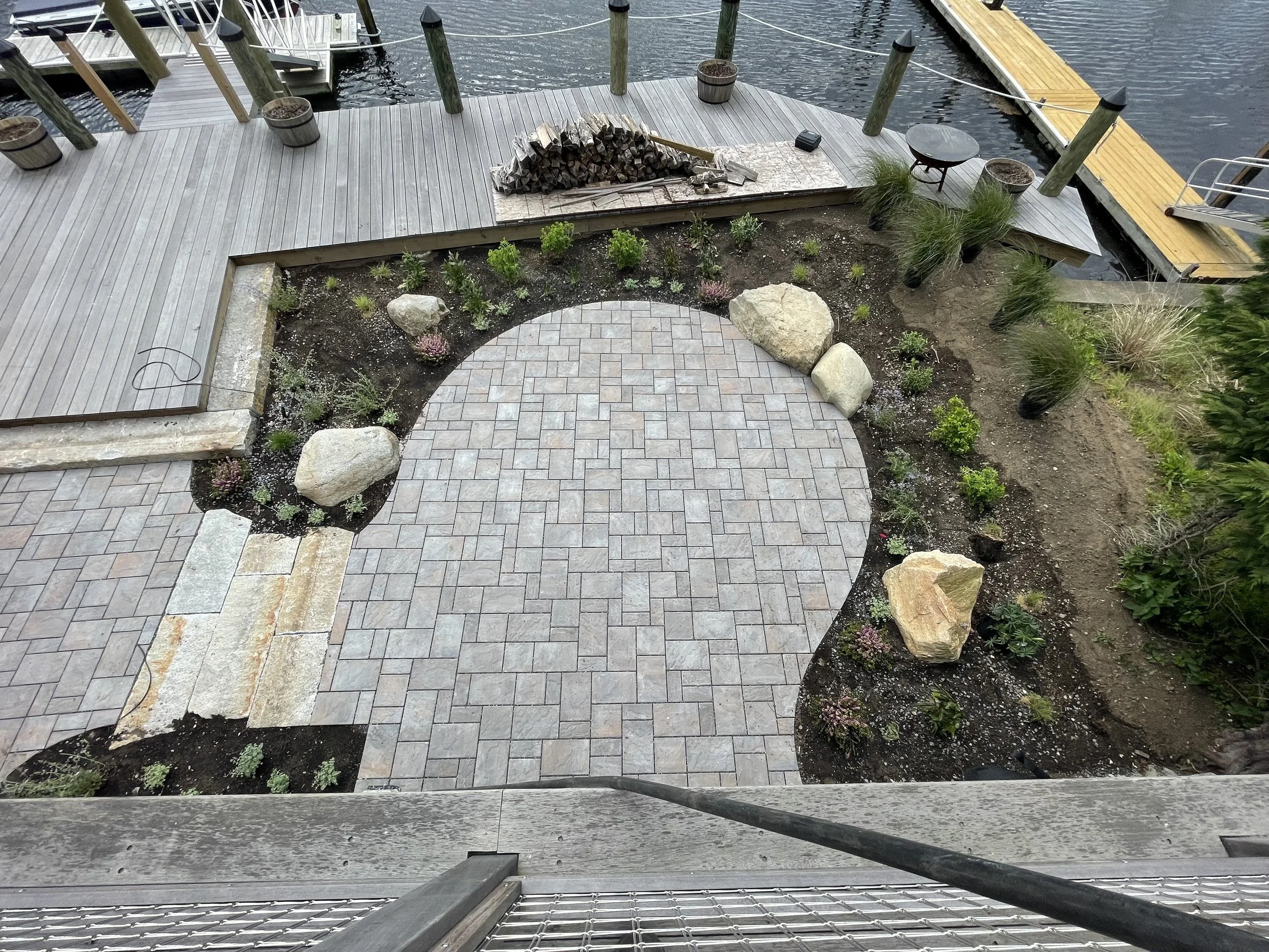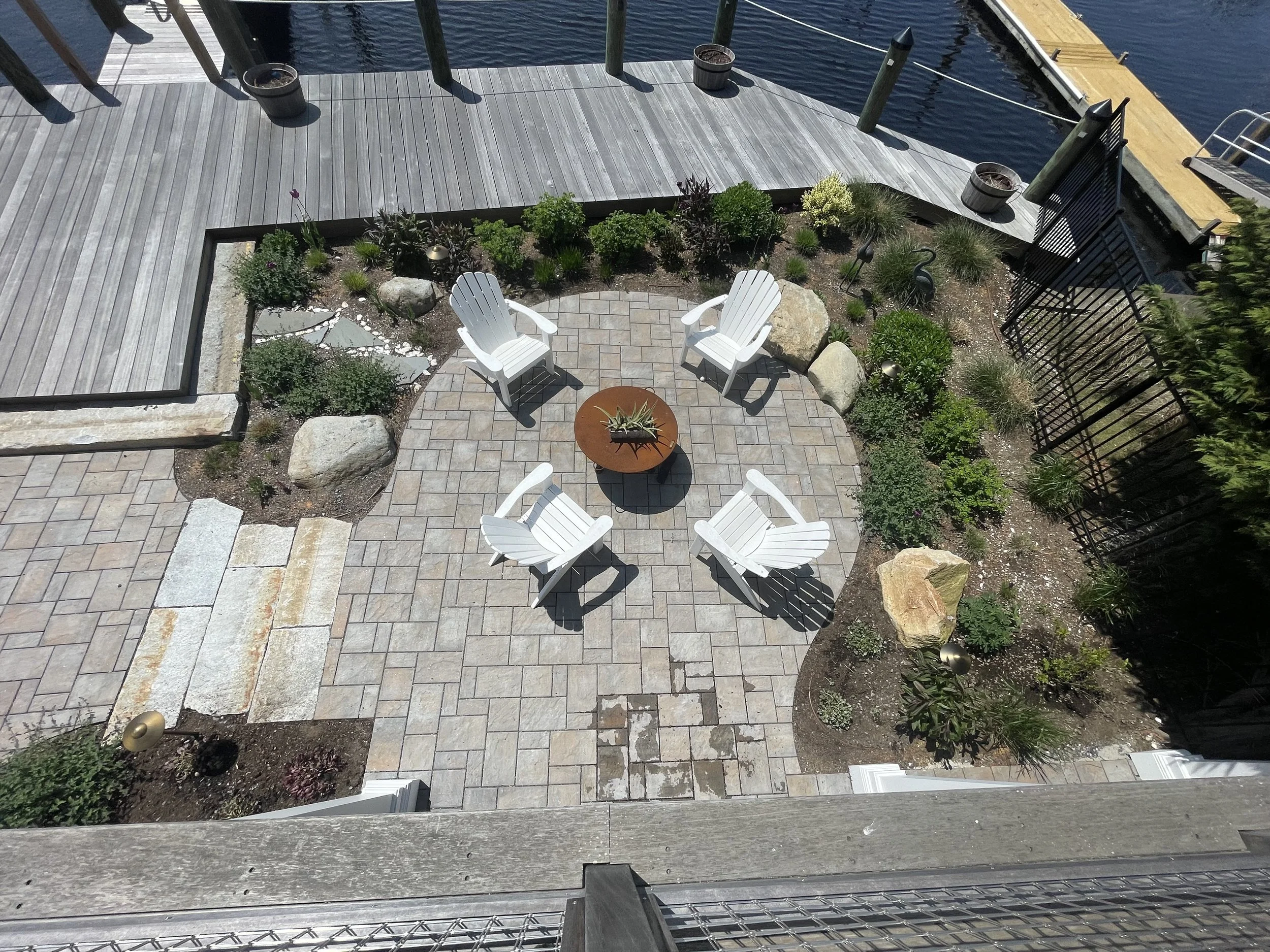 Below, a paver pathway leads to a more informal fire pit patio tucked behind the guesthouse and surrounded by relaxed coastal plantings. Nearby, a reclaimed granite landing creates a welcoming entrance to the reimagined boathouse.