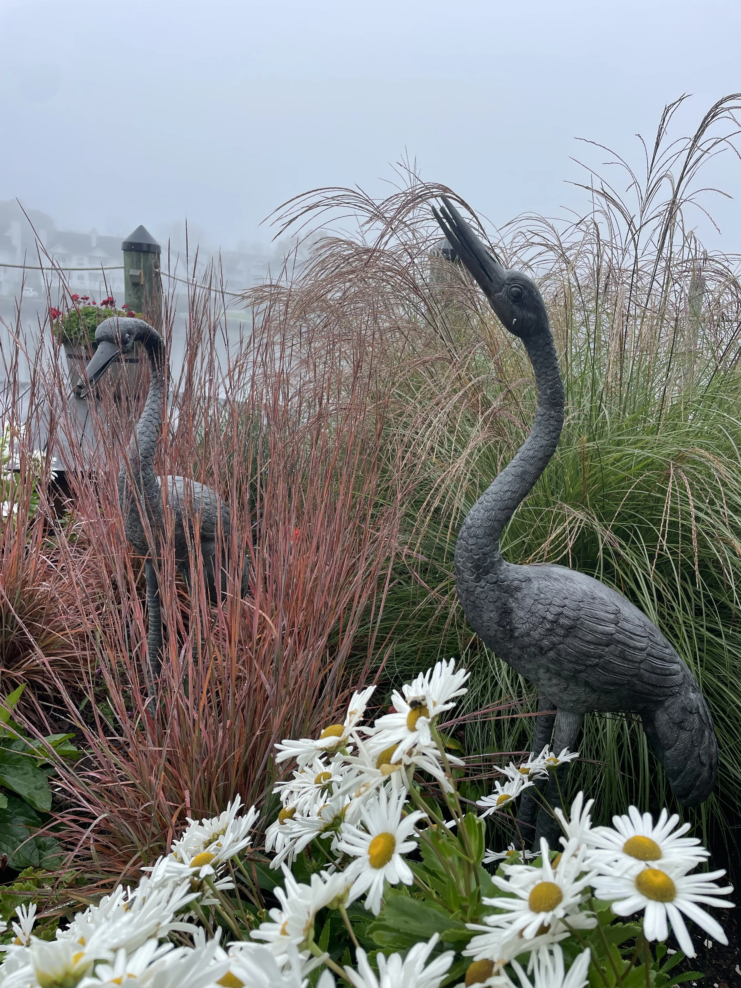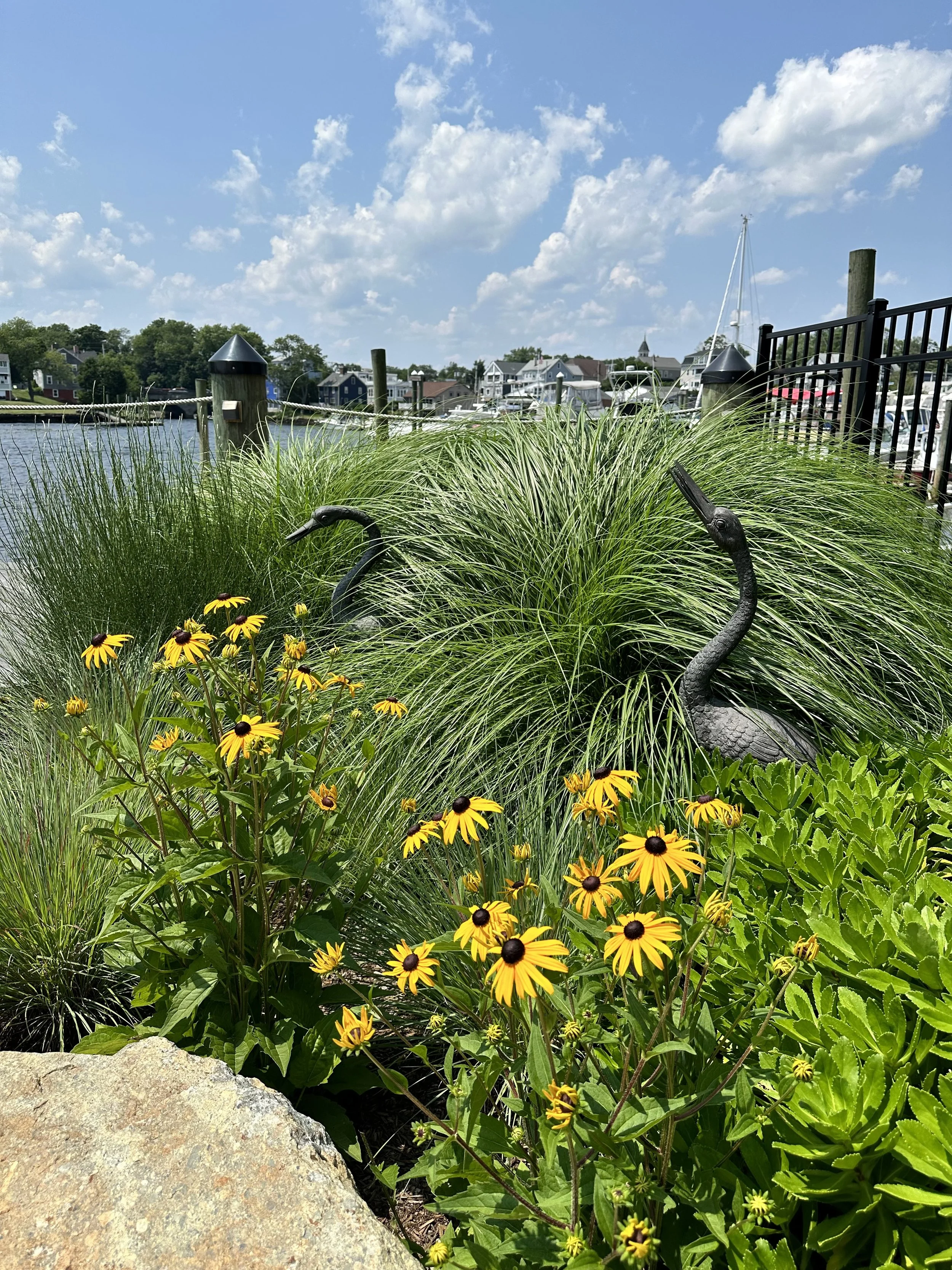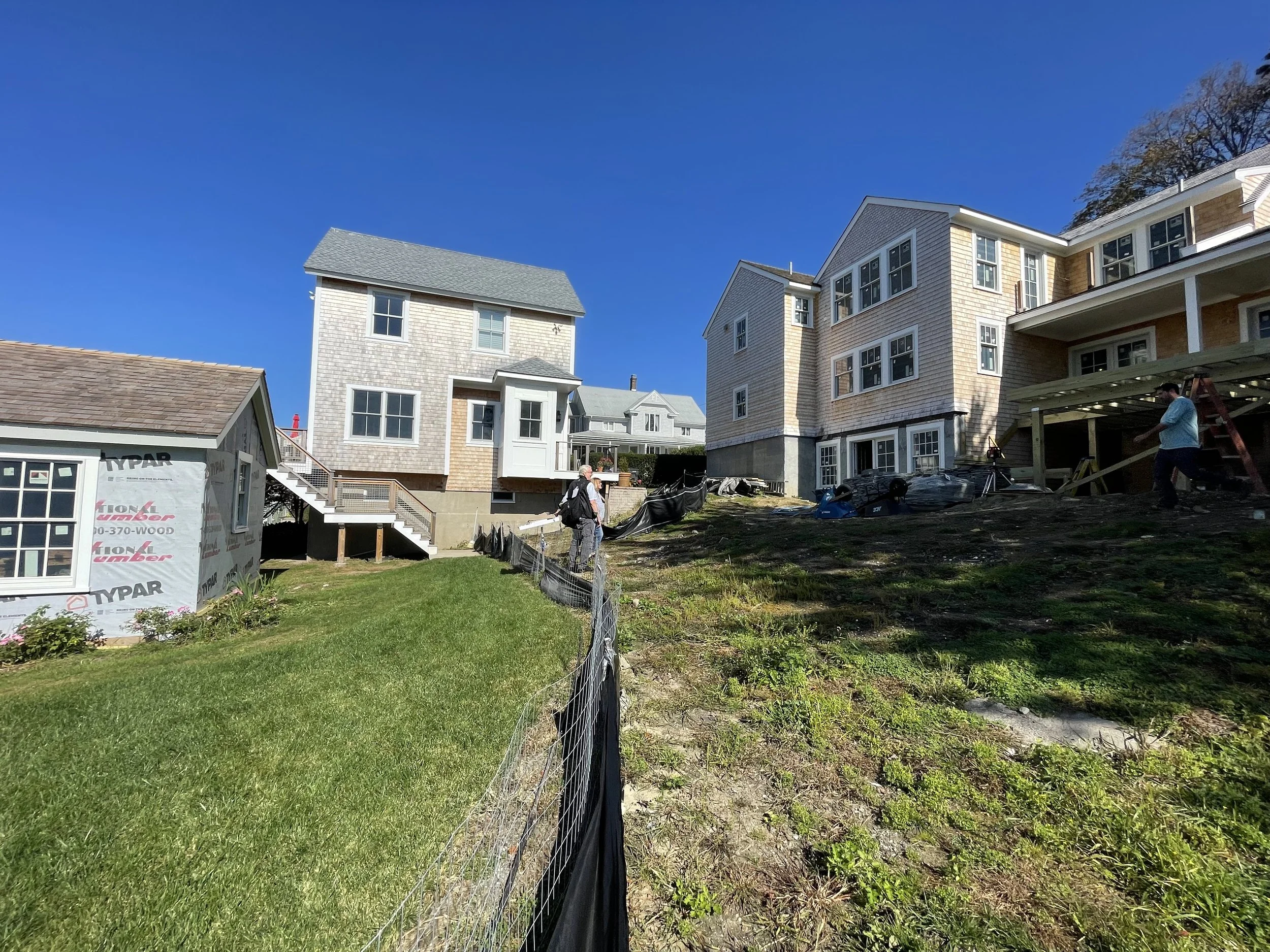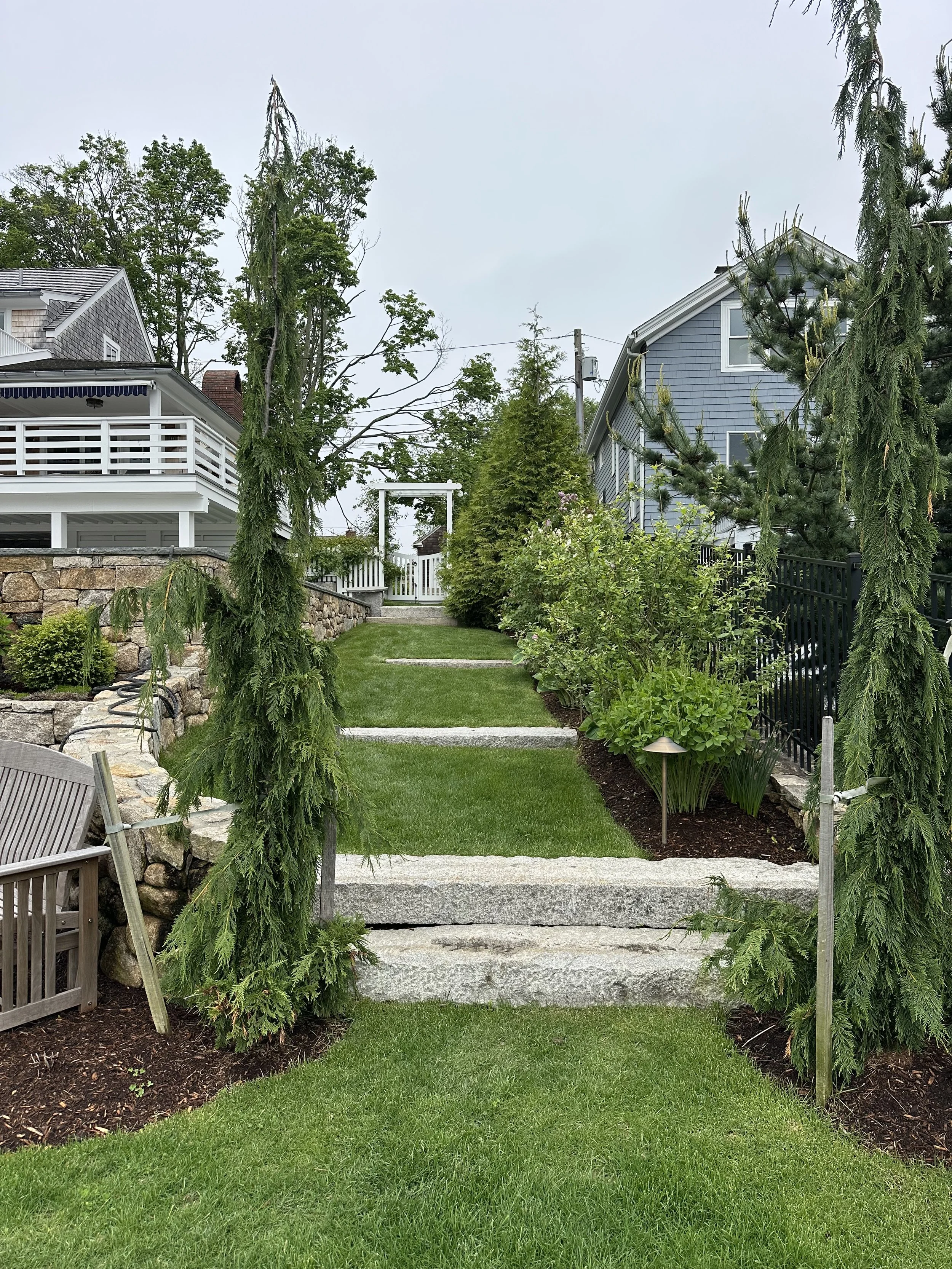 Below, a paver pathway leads to a more informal fire pit patio tucked behind the guesthouse and surrounded by relaxed coastal plantings. Nearby, a reclaimed granite landing creates a welcoming entrance to the reimagined boathouse.