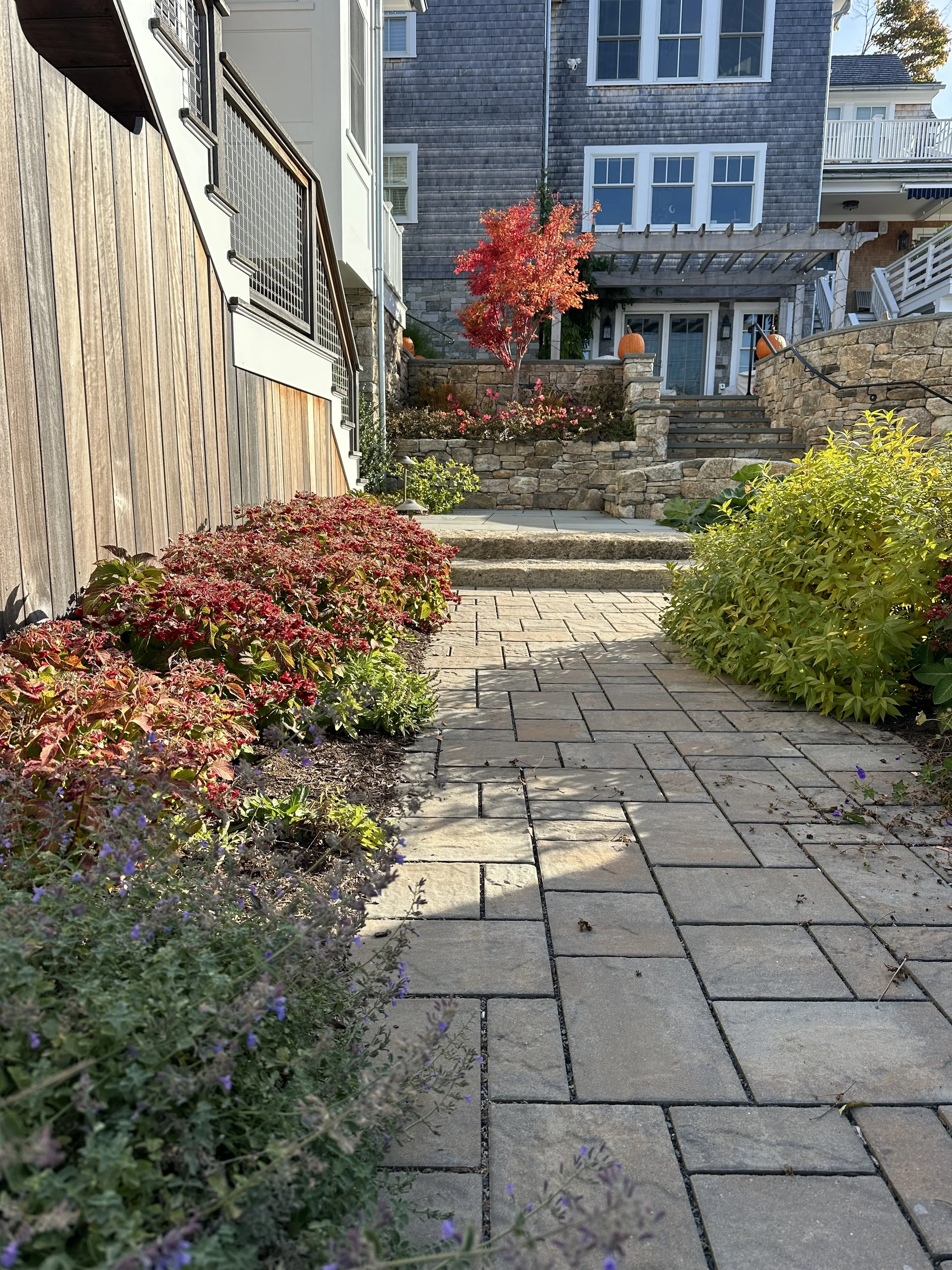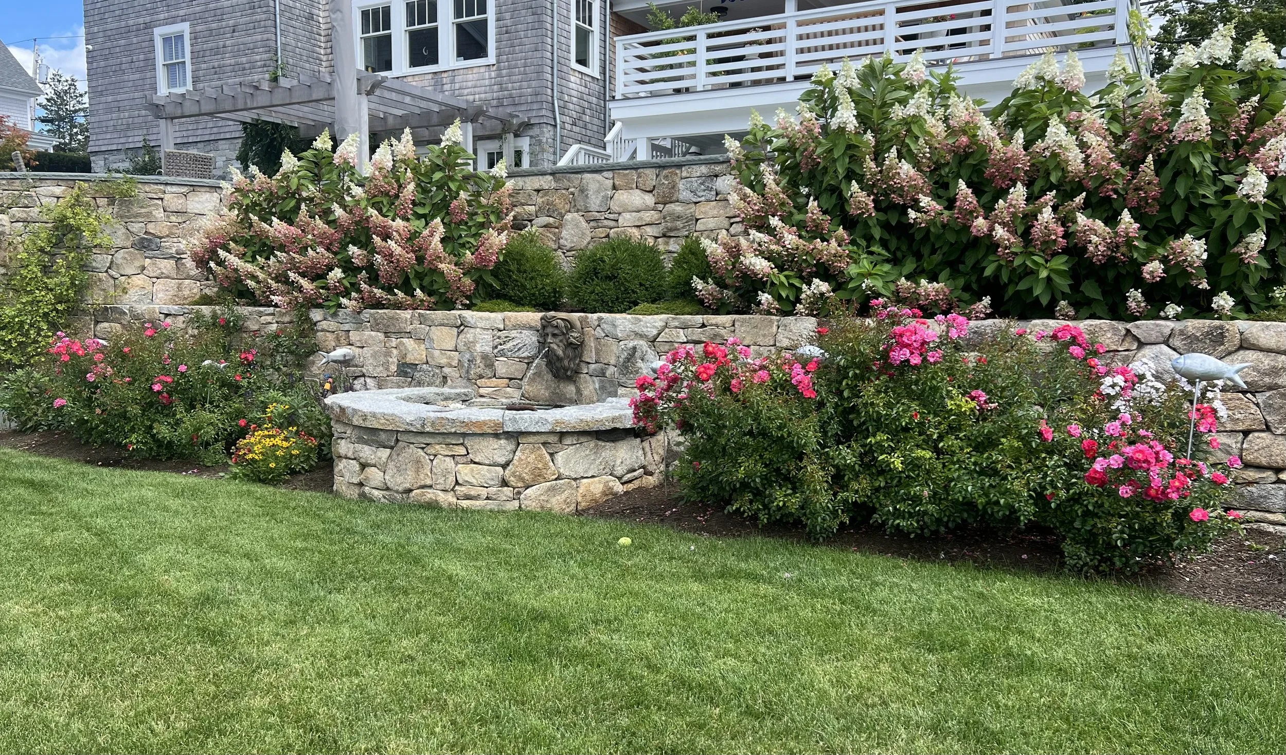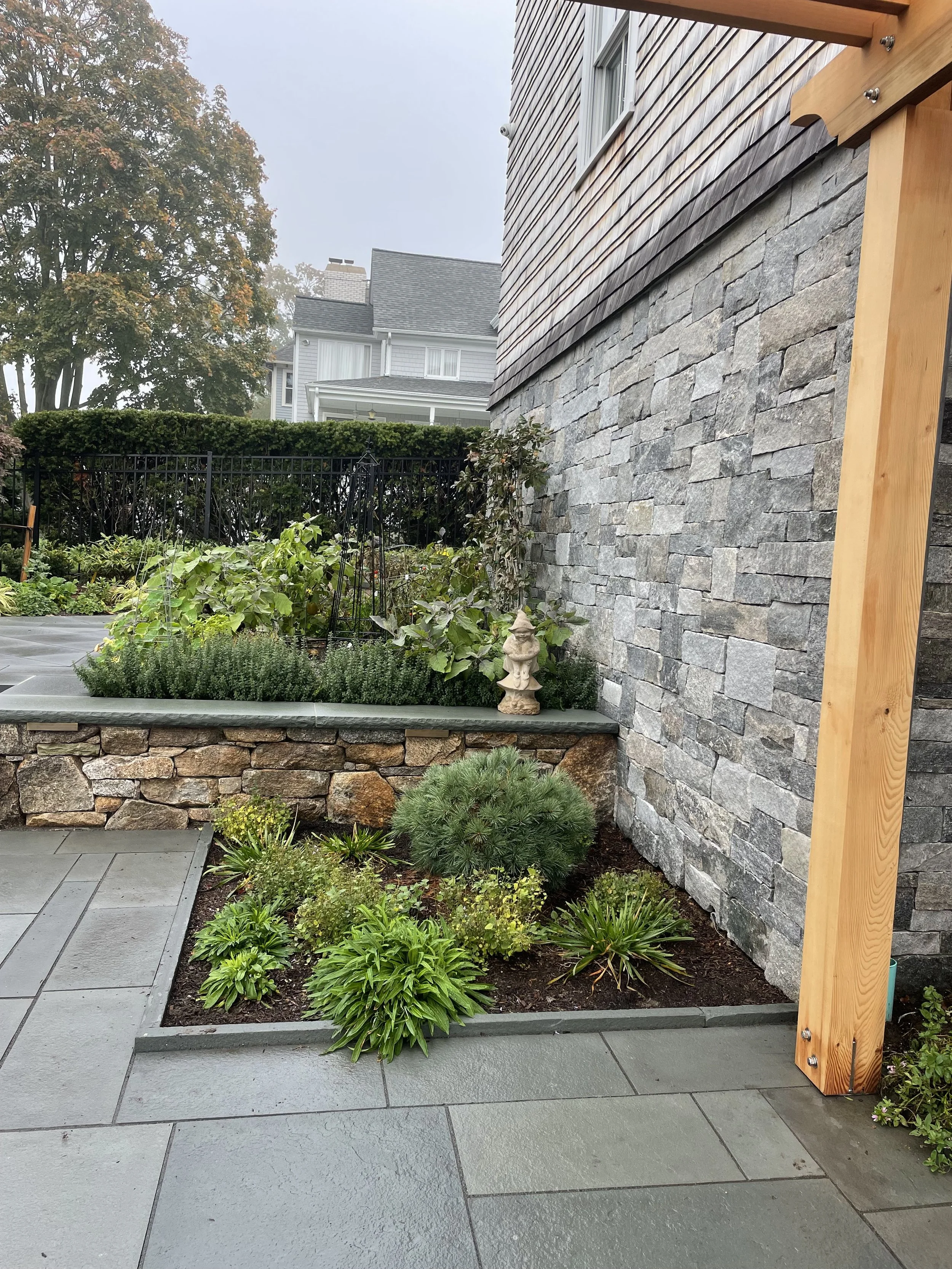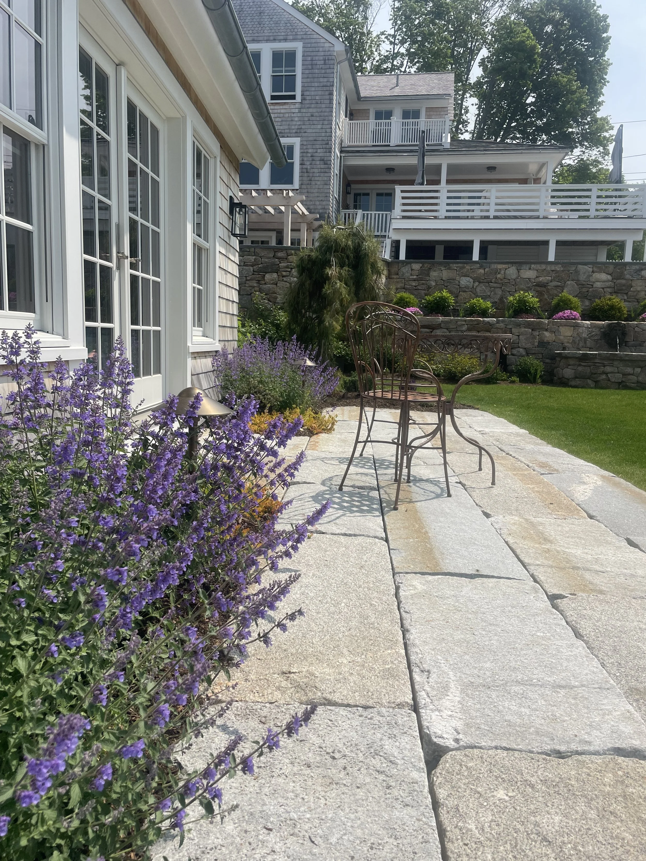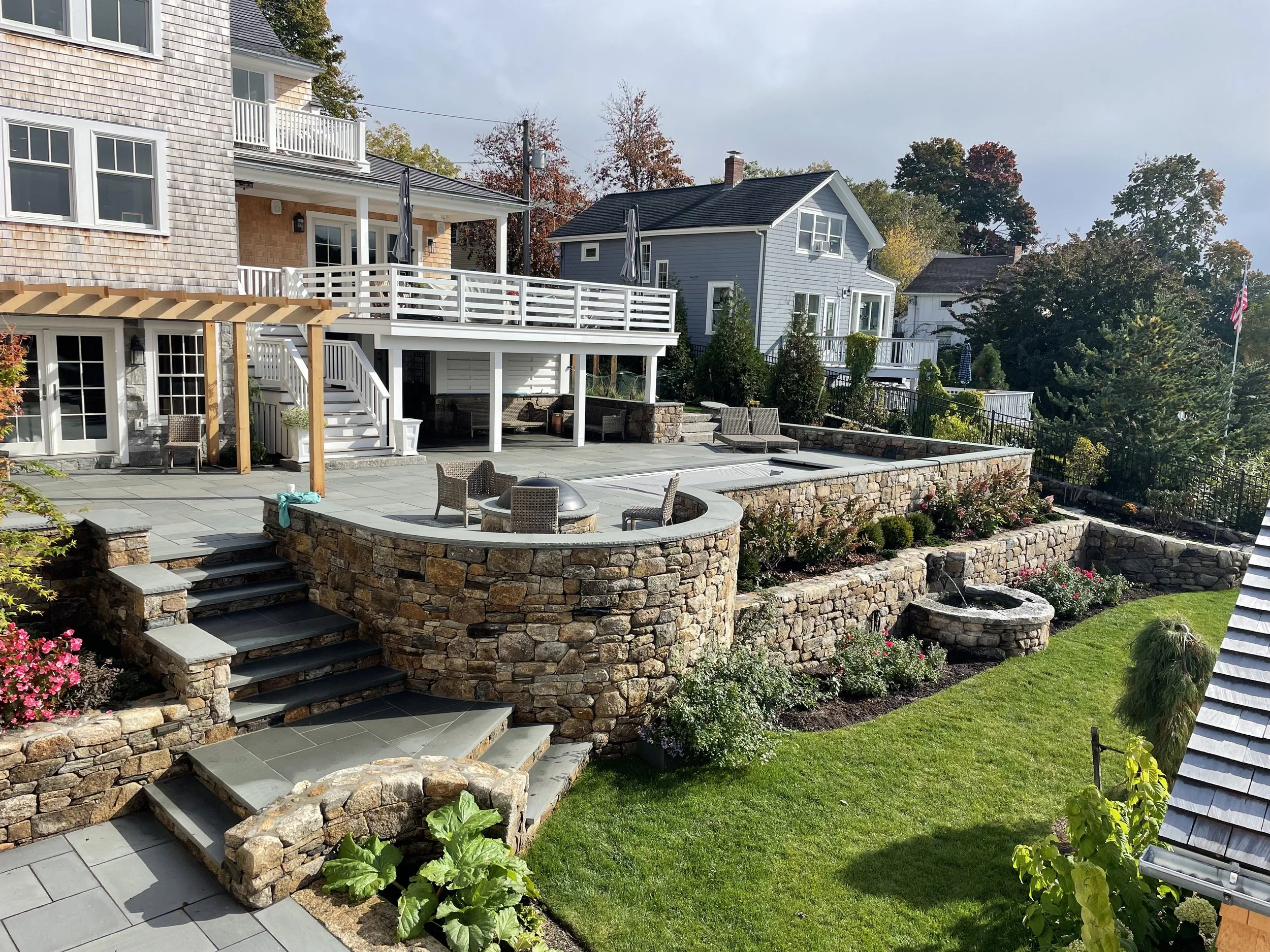 Custom fieldstone retaining walls anchor the design and shape multiple terraces that create distinct garden rooms and intimate vignettes. A large bluestone terrace with a small pool forms the central gathering space, seamlessly connected to the house for outdoor dining and relaxation.
